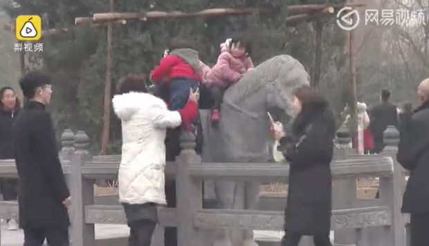 Chinese tourists ignore warnings, clamber over ancient statues