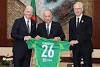 استقبل الرئيس الجزائري عبد المجيد تبون، اليوم الخميس، السويسري جياني إنفانتينو، رئيس الاتحاد الدولي لكرة القدم (فيفا)، الذي يقوم بزيارة رسمية للجزائر على رأس وفد ضم أيضا المدرب الفرنسي الشهير أرسين فينغر. وجاء في بيان مقتضب لرئاسة الجمهورية ان اللقاء حضره بوعلام بوعلام، مدير ديوان رئاسة الجمهورية، ووليد صادي وزير الرياضة، وكمال سيدي السعيد مستشار لدى رئيس الجمهورية مكلف بالمديرية العامة للاتصال. الرئيس الجزائري عبد العزيز تبون رفقة المدرب أرسين فينغر ورئيس الفيفا جياني إنفانتينو (مواقع تواصل).